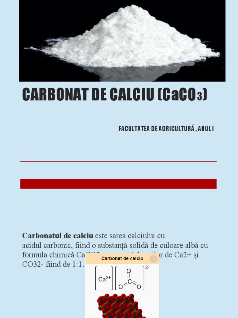 Se foloseste la gradinarit actionand ca o sursa hranitoare pentru plante si imbunatateste consumul de substante nutritive precum fosfor potasiu sau azot. Referat carbonat de calciu utilizari. Carbonatul de calciu este o substanta solida de culoare alba cu formula chimica caco3 este o sare carbonat a calciului cu acidul carbonic raportul ionilor de ca 2 si co3 2 fiind de 1 1. Se estimează că aproximativ 4 la suta din scoarța pământului este alcătuită din carbonat de calciu.