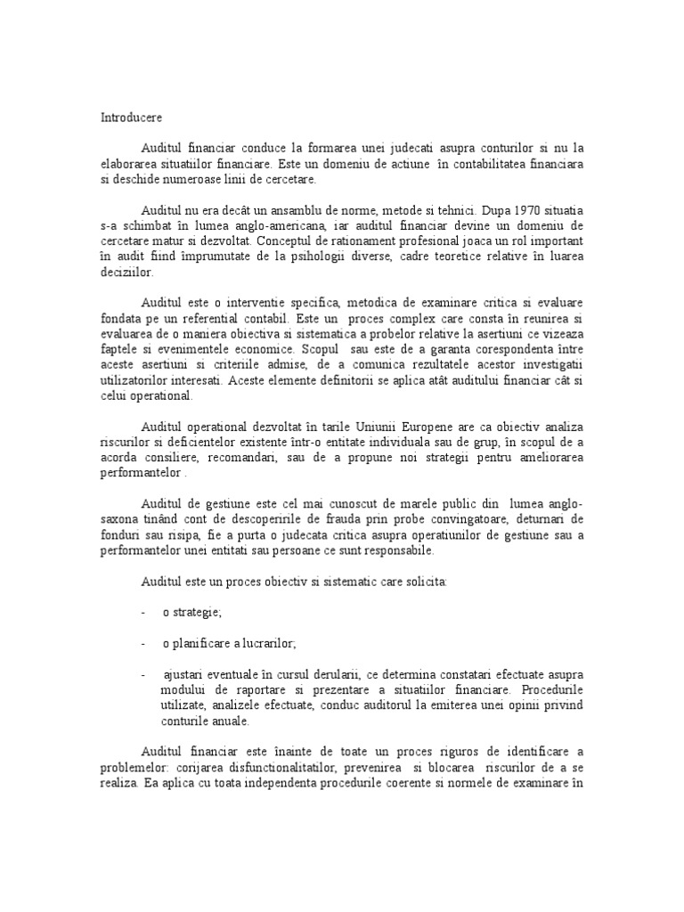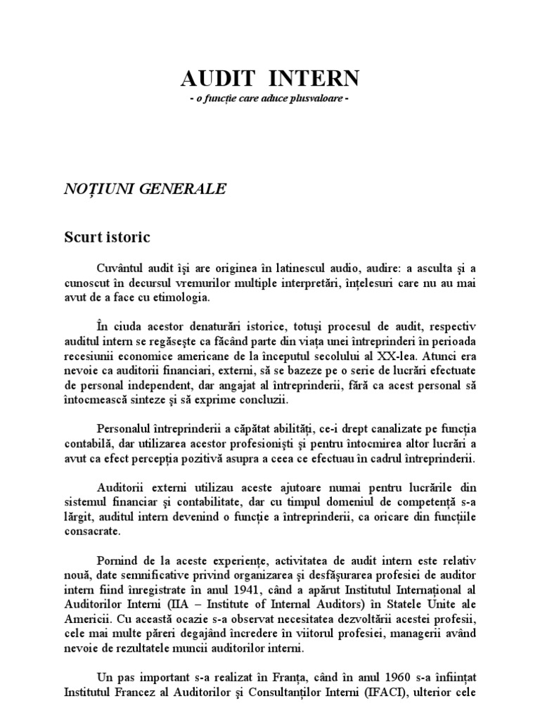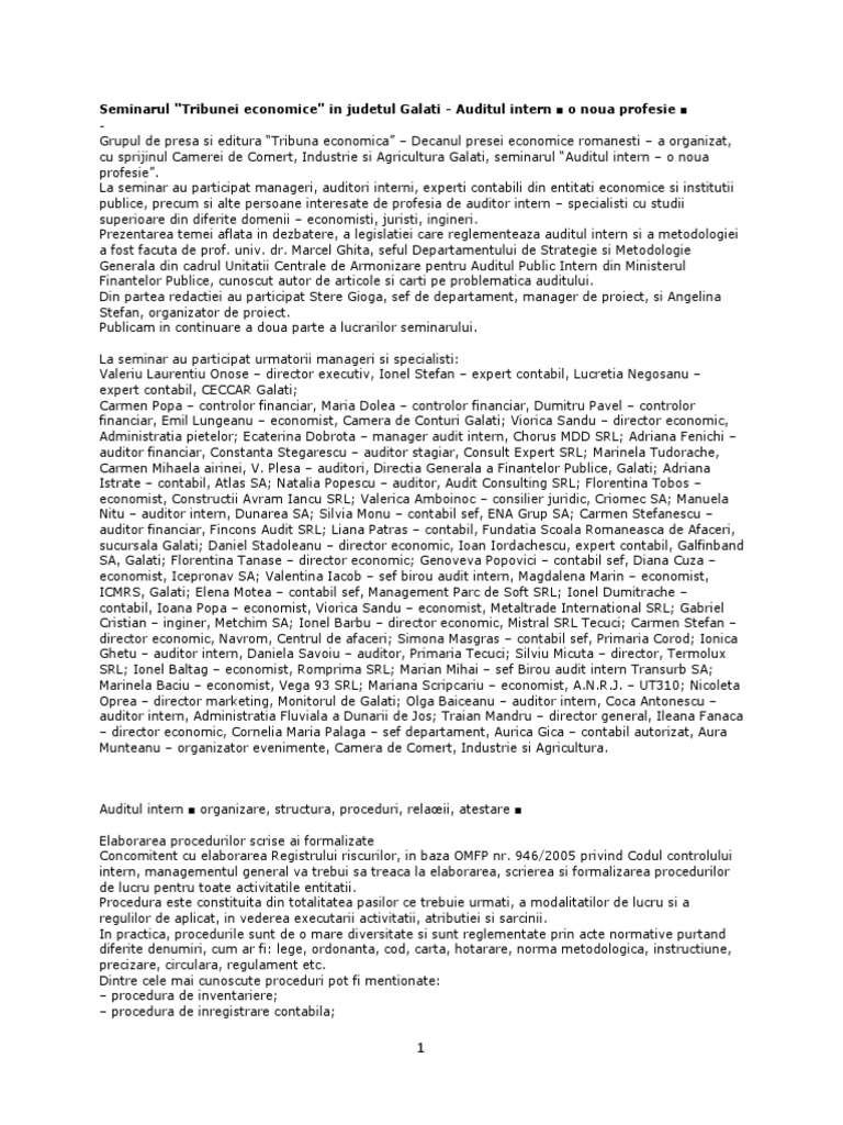 Durata mandatului lor este de 3 ani si pot fi realesi. 1 standardul ocupațional auditor intern în sectorul public reprezintă documentul prin care se descrie ocupația de auditor intern în sectorul public respectiv ceea ce trebuie să cunoască și să fie capabilă să facă o persoană care are calitatea de auditor intern pentru a fi competentă la locul de muncă. Managementul unei organizatii va primi dupa un audit intern o parere obiectiva si independenta cu privire la faptul ca riscurile la care era supusa organizatia sunt ameliorate sau nu la un. Art 7 obiectivele aferente unei activitati de audit public intern.