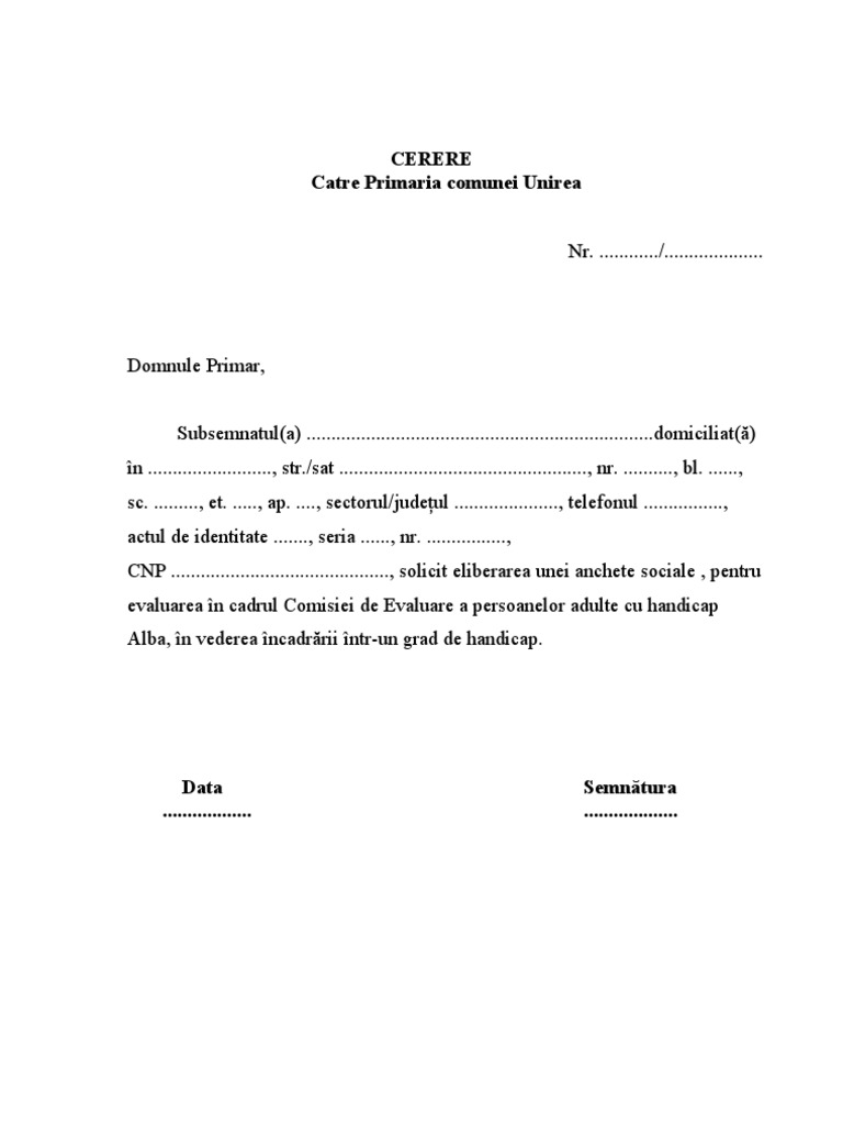 Cerere catre domnul primar. Catre domnul primar domnule primar din moment ce aduceti toti nu vreau sa i numesc in oras cu autobuzele dumneavoastra ar trebui sa aveti grija ca puii oamenilor de la tara sa nu mai vina la blocuri in special in centru sa ne deranjeze linistea de la primele ore ale diminetii si sa lase o mizerie indescriptibila nu cred ca suntem obligati sa le auzim limbajul porcos si ireproductibil pe care l au. Cerere pentru eliberarea certificatelor duplicat cerere schimbare a numelui pe cale administrativă cerere de transcriere certificate în registrele de stare civilă declaraţie de recunoaştere copil declaraţie de înregistrare tardivă a naşterii până la un an cerere pentru eliberare livret de familie cerere pentru eliberare certificat de naştere în baza unei sentinţe civile. O cerere reprezintă o solicitare formulată în scris și nu trebuie să fie nici prea scurtă dar nici prea lungă mai exact ne trebuie doar o foaie de hârtie format a4 obișnuită. Dragii mei am primit cu multă bucurie scrisorile voastre şi am avut extraordinara surpriză să constat că sunteţi profund interesaţi de bunul mers al activităţii mele în slujba cetăţenilor comunei noastre.