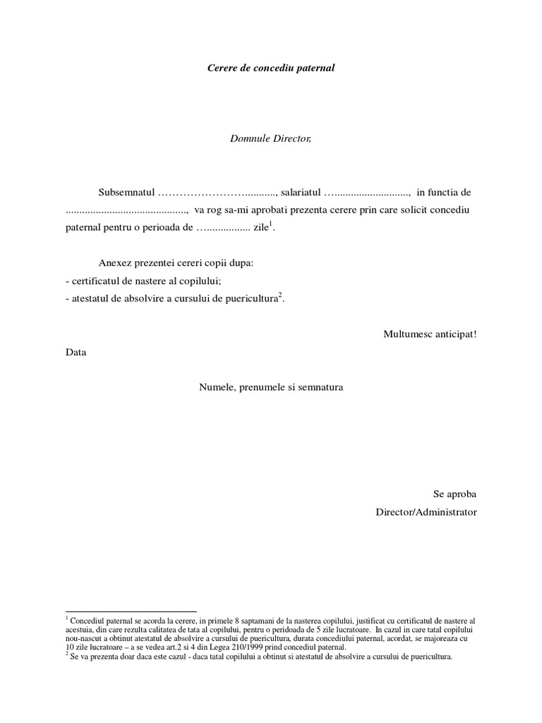 User last modified by. Echipa leaveboard vă oferă gratuit modelul de cerere de concediu evenimente deosebite precum nașterea unui copil al salariatului sau adopția căsătoria salariatului decesul unuia din părinți sau bunici. In functie de angajator si de normele interne concediul de odihna poate fi mult mai mare de 20 de zile. Acest tip de concediu fără plată pentru formare profesională se poate efectua și fracționat în cursul unui an calendaristic pentru susținerea examenelor de absolvire a unor forme de învățământ sau pentru susținerea examenelor de promovare în anul următor în cadrul instituțiilor de învățământ superior.
