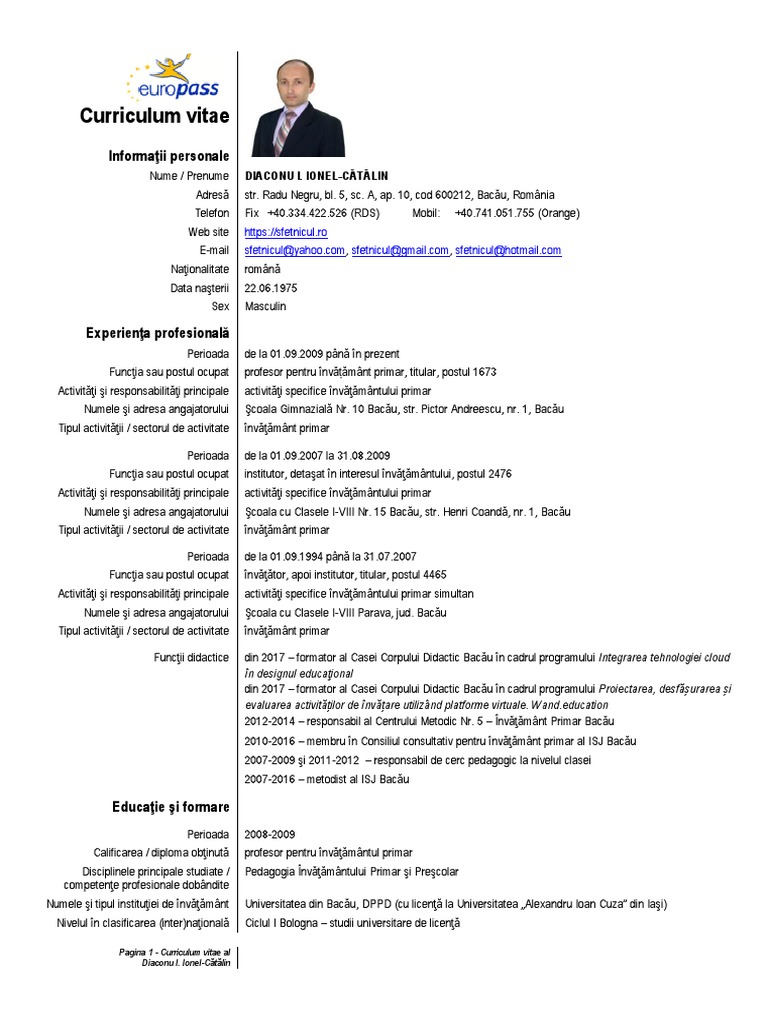 Cv europass cadru didactic. Curriculum vitae gabriel popa 2 perioada 1997 1990 funcţia sau postul ocupat asistent universitar cadru didactic titular universitatea politehnica din bucureşti facultatea de transporturi catedra material rulant de cale ferată numele şi adresa angajatorului universitatea politehnica din bucureşti. Activităţi didactice tipul sau sectorul de activitate educație 2016 atestat formator şi supervizor în psihoterapie. Este un model de cv bine structurat și nici prea mare. Cadru didactic anatomie medic primar radiologie imagistică medicală educaţie şi formare perioada din 1976 şi în prezent.