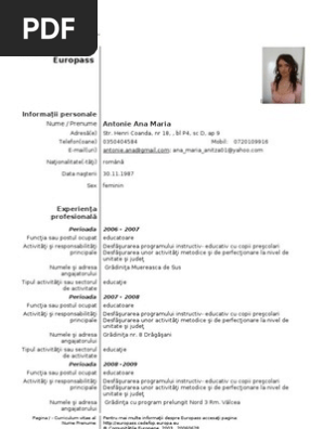 2014 atestat de formare continuă a personalului didactic optimizarea învățării în programe after school 2014 certificat de absolvire a modulului folosirea tehnologiilor de comunicație. Curriculum vitae leontieş rodica 10 04 2013 responsabilităţi profesor diriginte clasa a x a c. Activităţi didactice tipul sau sectorul de activitate. Model de curriculum vitae europass 1 ianuarie 2008 02 52 util in activitatea scolara si extrascolara obligatoriu de consultat si de completat de catre elevii de liceu din clasele terminale materiale de lucru in orele de dirigentie.