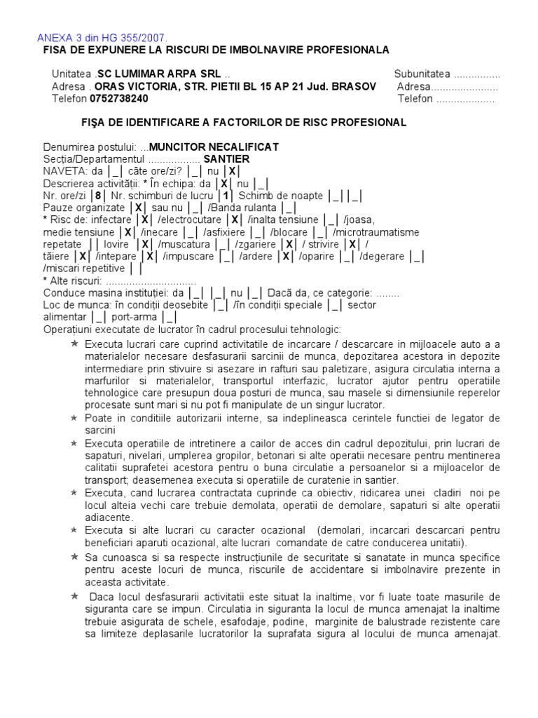 Fisa De Expunere La Riscuri Profesionale Model Completat