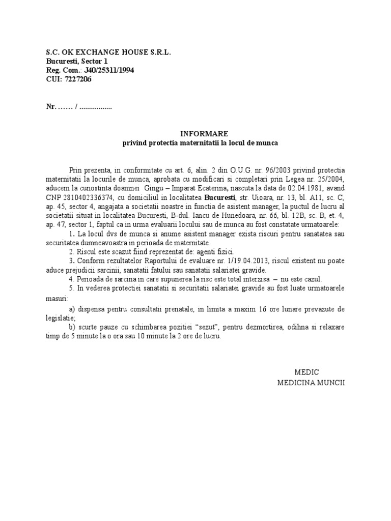 Informare privind protectia maternitatii la locul de munca. Prin prezenta in conformitate cu art 6 alin 2 din o u g. 96 2003 privind protectia maternitatii la locurile de munca aprobata. Informare privind protectia maternitatii. 537 din 7 aprilie 2004 pentru aprobarea normelor metodologice de aplicare a prevederilor ordonantei de urgenta a guvernului nr.