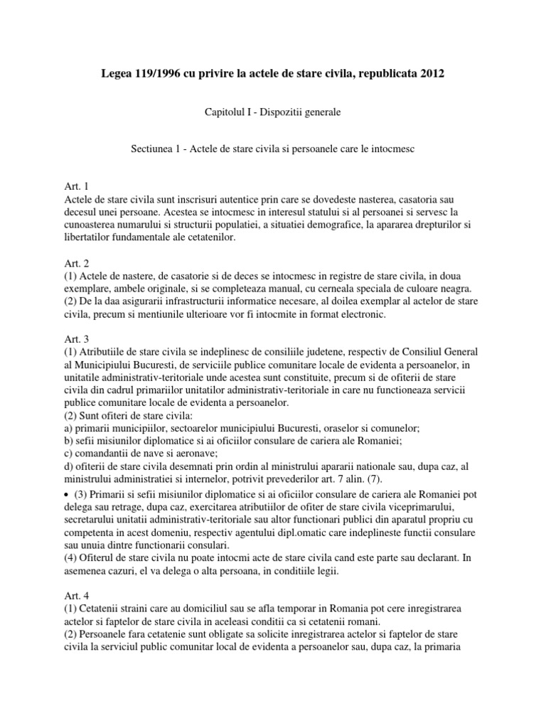 95 2006 privind reforma in domeniul sanatatii cu modificarile si completarile ulterioare in temeiul prevederilor art. 339 din 18 mai 2012. 4 din hot ărârea guvernului nr. 119 1996 cu privire la actele de stare civilă.