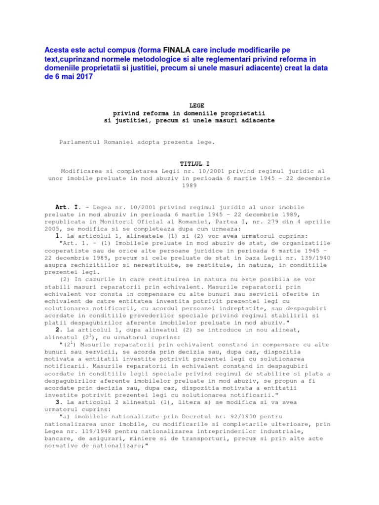 10 din 8 februarie 2001 republicată în monitorul oficial nr. 1 095 2005 publicata in monitorul oficial al romaniei partea i nr. 10 2001 privind regimul juridic al unor imobile preluate în mod abuziv în perioada 6 martie 1945 22 decembrie 1989 republicată în monitorul oficial al româniei partea i nr. 247 din 19 iulie 2005 privind reforma in domeniile proprietatii si justitiei precum si unele masuri adiacente.
