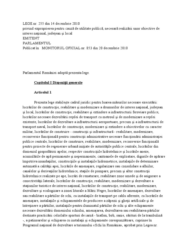 255 2010 privind exproprierea pentru cauză de utilitate publică necesară realizării unor obiective de interes național județean și local prin utilizarea lege5 îți exprimi acordul cu privire la faptul că folosim module cookie în scopul îmbunătățirii conținutului în vederea analizării traficului precum și împotriva utilizării neautorizate. Legea 255 2010 privind exproprierea pentru cauză de utilitate publică necesară realizării unor obiective de interes naţional judeţean şi local publicata in monitorul oficial nr. 255 din 14 decembrie 2010 emitent. 581 din 20 iulie 2017 s a admis excepția de neconstituționalitate constatându se că soluția legislativă cuprinsă în art.
