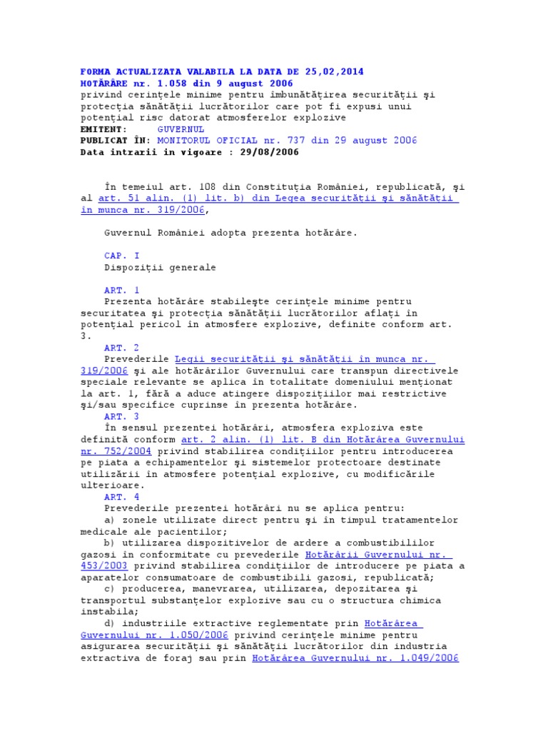 319 din 14 iulie 2006 actualizată a securităţii şi sănătăţii în munca. 319 2006 a securității și sănătății în muncă modificări 4 puneri în aplicare 3 admiteri de neconstituționaliate parțială sau cu rezervă de interpretare 1 respingeri de neconstituționalitate 6 referințe 12 derogări 1 reviste 64 doctrine 6 modele 8 proceduri 2 comentarii expert. Actualizata in 24 octombrie 2012 prin legea 187 din 2012. 18 aprilie 2012 prezenta forma actualizata este valabila de la 24 martie 2012 pana la 18 aprilie 2012 forma actualizată a acestui act normativ până la data de.