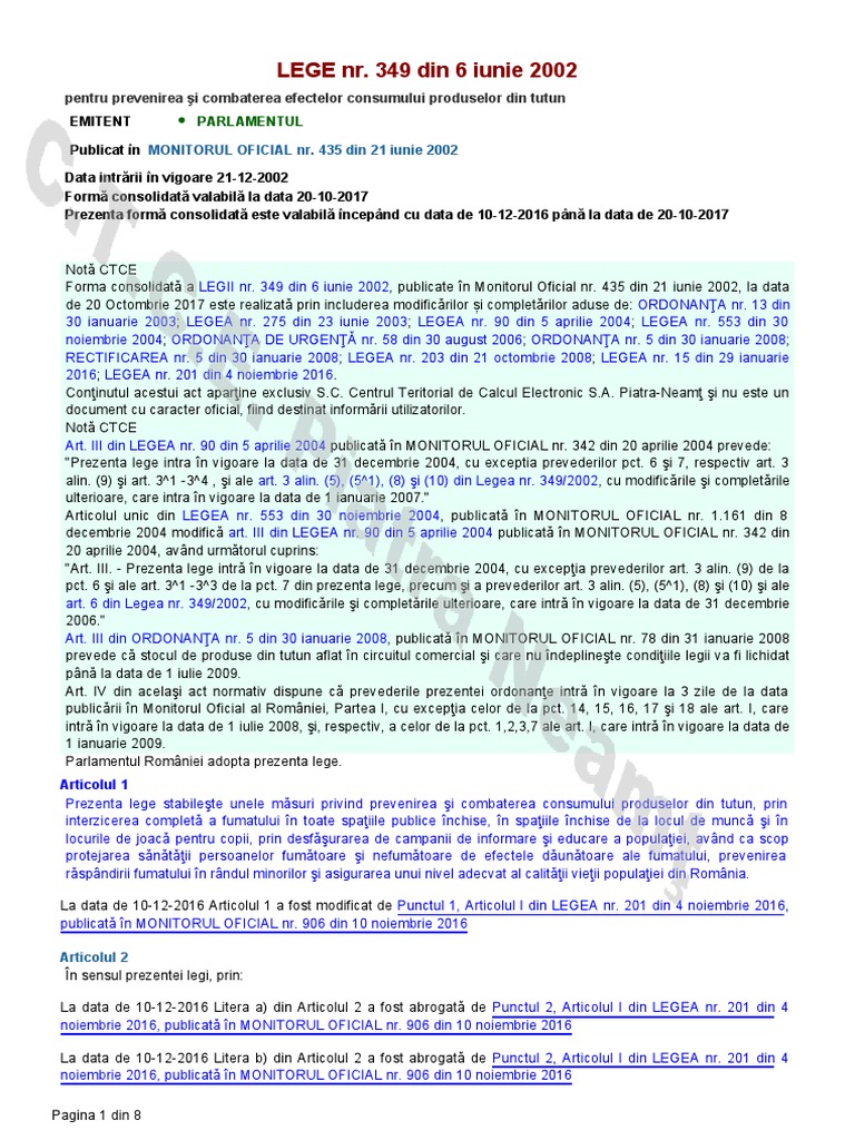 435 din 21 iunie 2002. 349 2002 pentru prevenirea şi combaterea efectelor consumului produselor din tutun din 5 aprilie 2004 monitorul oficial 342 2004. 5 2008 privind modificarea şi completarea legii nr. 349 2002 pentru prevenirea și combaterea efectelor consumului produselor din tutun modificări 7 puneri în aplicare 5 respingeri de neconstituționalitate 1 referințe 5 reviste 4 referințe în jurisprudență text publicat în monitorul oficial partea i nr.