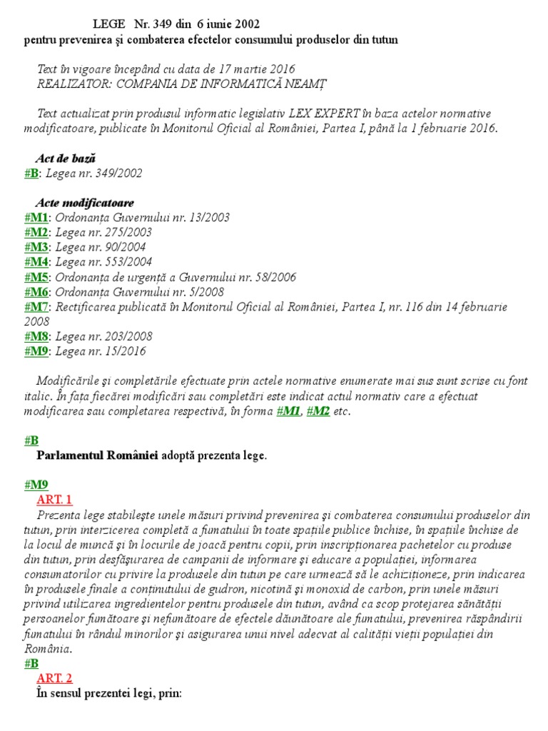1 din legea nr. 349 2002 pentru prevenirea si combaterea efectelor consumului produselor din tutun consolidata 31 10 2008 publicata in monitorul oficial partea i nr. Legea 349 2002 prevenirea şi combaterea efectelor consumului produselor din tutun actualizată prin.