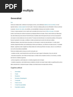 încă nu s a găsit tratamentul care să vindece această boală însă manifestările ei pot fi ținute sub control prin anumite proceduri. Scleroza multipla progresiva secundara apare in urma unei evolutii a altei forme de scleroza multipla. Scleroza multiplă este o boală autoimună care nu se vindecă dar există tratament care îmbunătăţeşte starea pacienţilor. Cercetatorii de la harvard medical school au descoperit noi variatii genetice care se pare ca duc la cresterea procentajului de risc a sclerozei multiple descoperirea este rezultatul unui studiu international de mare amploare care a cercetat bazele genetice ale sclerozei multiple o boala autoimuna a sistemului nervos central in.