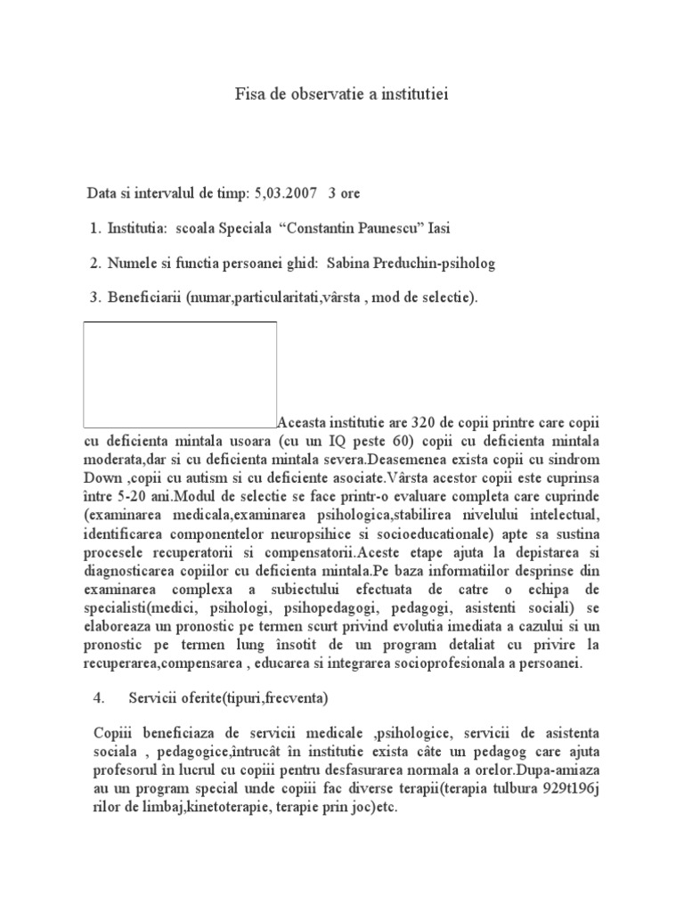 Foarte buna buna medie slaba foarte slaba. Acest model este util pentru toate ciclurile de invatamant. 1 2 universitatea din craiova facultatea de matematică și științe ale naturii departamentul de informatică fișă de observație evaluare săptămânală1 1 student practicant geo georgescu 2 săptămâna i 3 adresa unde s a derulat stagiul de pregătire practică cl bucuresti nr. Scribd is the world s largest social reading and publishing site.
