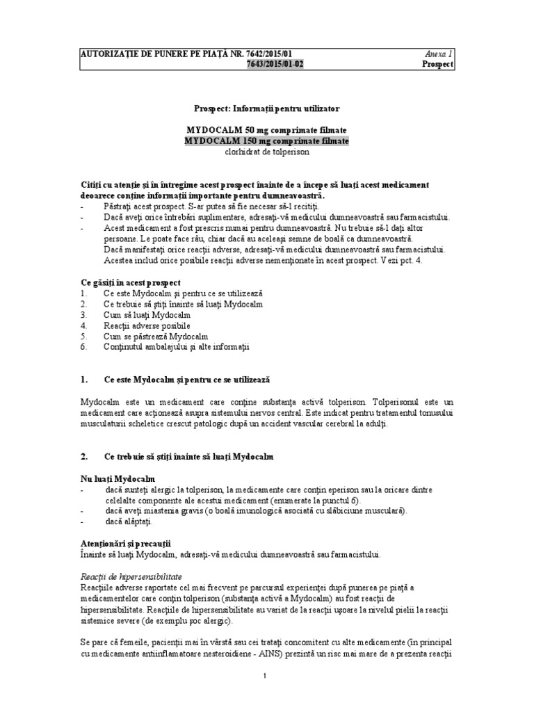 Ingredient matches for mydocalm mite 50mg tolperisone. Mydocalm 50 mg comprimate filmate conţine lactoză monohidrat 48 892 mg per comprimat. Mydocalm tablete filmate de 50 mg. Dacă medicul dumneavoastră v a atenţionat că aveţi intoleranţă la unele categorii de glucide vă rugăm să l întrebaţi înainte de a lua acest medicament.