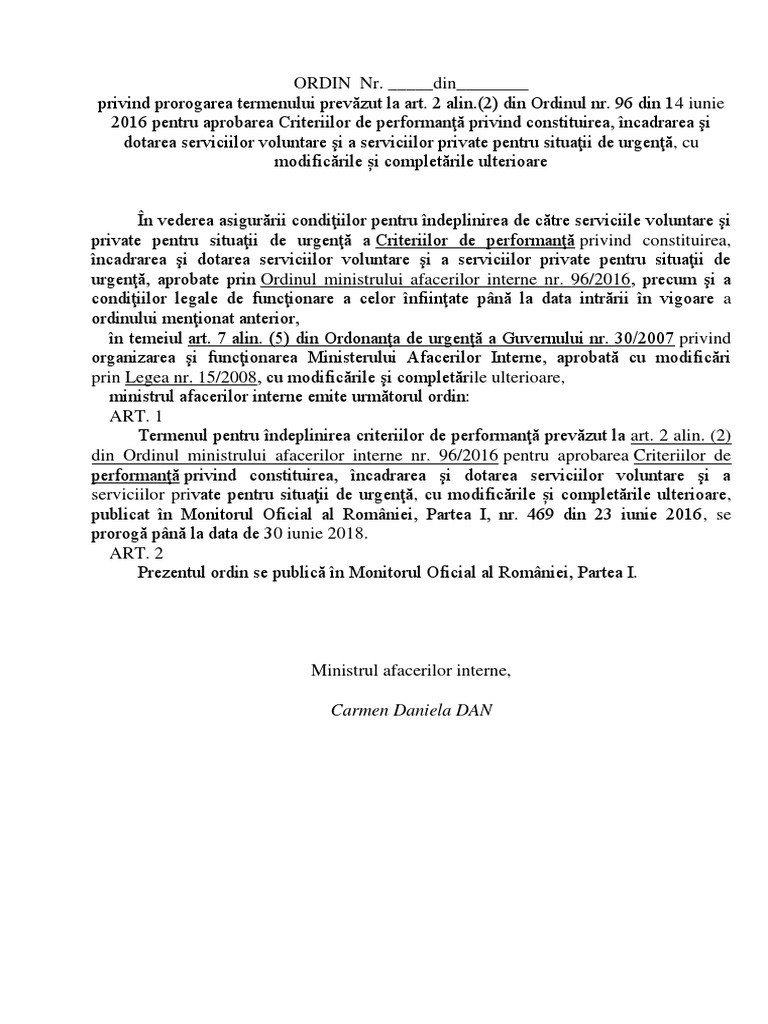 96 2016 pentru aprobarea criteriilor de performanţă privind constituirea încadrarea şi dotarea serviciilor voluntare şi a serviciilor private pentru situaţii de urgenţă va intra în vigoare de la 23 07 2016 publicat în monitorul oficial partea i nr. 96 din 9 noiembrie 2018 privind prorogarea unor termene precum si pentru modificarea si completarea unor acte normative publicata in monitorul oficial numarul 963 din data de 14 noiembrie 2018. 469 din 24 iunie 2016. 387 din 5 iunie 2018 publicată în monitorul oficial al româniei partea i nr.