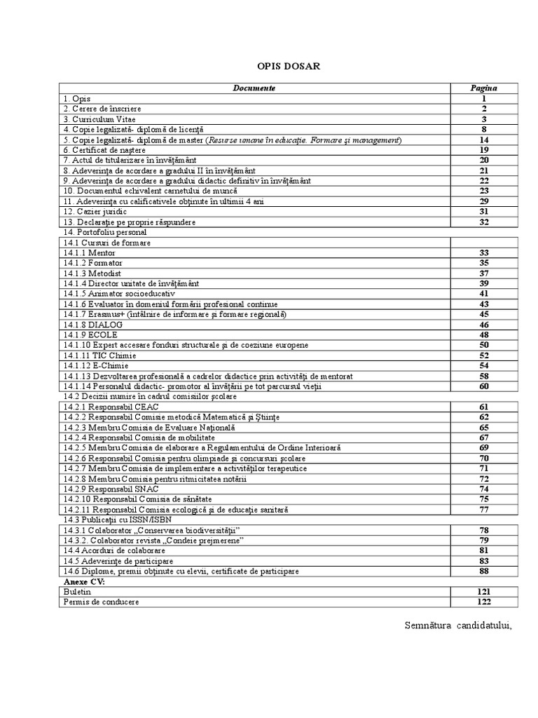 B cererea de înscriere. Pg filă opisul dosarului semnat de candidat şi semnat şi ştampilat de director unul se va restitui candidatului semnat de aici începe nume rotarea documente obligatorii. 1 021 2004 pentru aprobarea modelului comun european de curriculum vitae. Se numerotează începând cu cererea tip iar ordinea documentelor este următoarea.