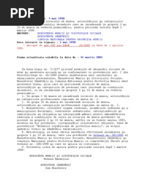 125 din 5 mai 1990 pentru precizarea locurilor de munca activitatilor si categoriilor profesionale cu conditii deosebite care se incadreaza in grupele i si ii de munca in vederea pensionarii pentru perioada lucrata dupa 1 martie 1990. Grupa ii de munca anexa nr. Ministerul muncii si ocrotirilor sociale ministerul sanatatii comisia nationala pentru protectia muncii. Anexa 1 anexa 2 grupe de muncă lpensii metodolgie incadrare in grupe ordin 125 1990 hg nr.