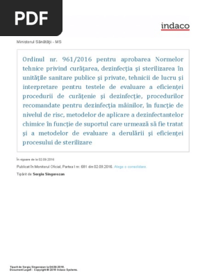 Ordinul ministerului sănătății nr. 961 2016 pentru aprobarea normelor tehnice privind curățarea dezinfecția și sterilizarea în unitățile sanitare publice și private tehnicii de lucru și interpretare pentru testele de evaluare a eficienței procedurii de curățenie și dezinfecție procedurilor. Forma consolidată a normelor tehnice din 19 august 2016 publicate în monitorul oficial nr. 961 din 19 august 2016 pentru aprobarea normelor tehnice privind curăţarea dezinfecţia şi sterilizarea în unităţile sanitare publice şi private tehnicii de lucru şi interpretare pentru testele de evaluare a eficienţei procedurii de curăţenie şi dezinfecţie procedurilor recomandate pentru dezinfecţia mâinilor în funcţie de nivelul de risc metodelor de aplicare a.