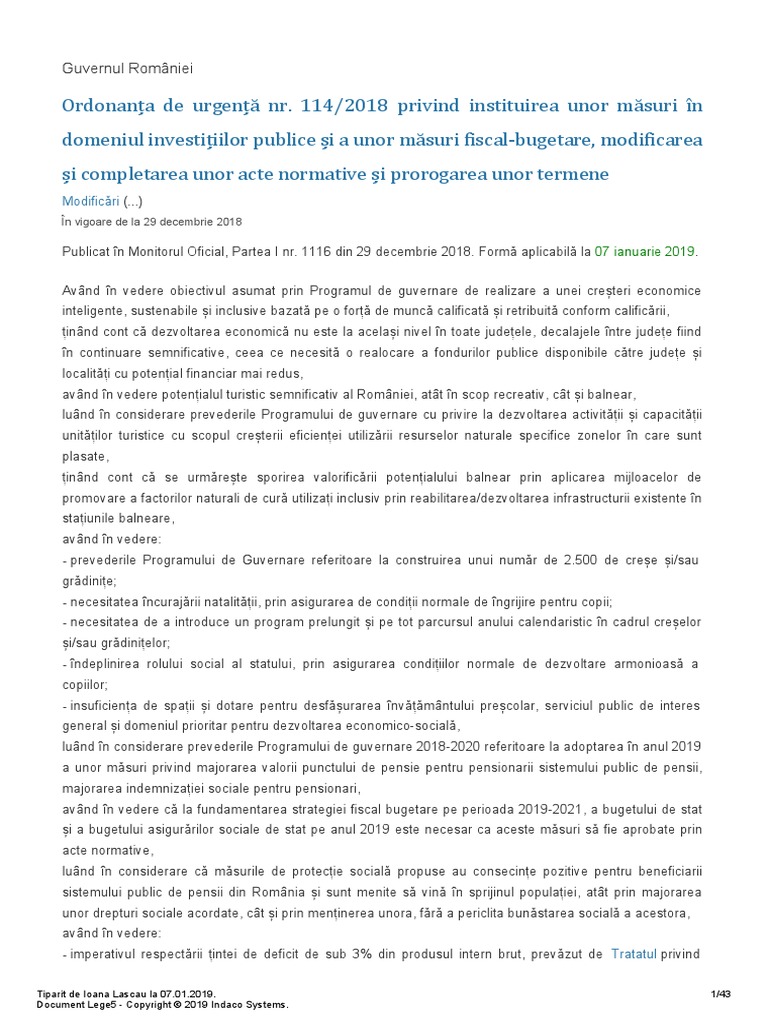 Guvernul româniei publicată în. Guvernul româniei publicată în. 114 din 28 decembrie 2018 privind instituirea unor măsuri în domeniul investiţiilor publice şi a unor măsuri fiscal bugetare modificarea şi completarea unor acte normative şi prorogarea unor termene publicată în. Ordonanţa de urgenţă are numărul 114 29 decembrie 2018.