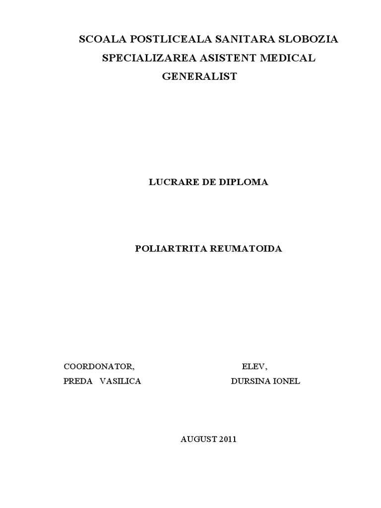 Poliartrita reumatoida lucrare licenta. Ingrijirea pacientilor cu poliartrita reumatoida. Lucrare de licenta pentru scoala postliceala sanitara specializarea asistenti medicali generalisti cuprins. Okazii ro magazine cu mii de calificative pozitive cumperi in siguranta prin garantia de livrare. Reumatism cronic progresiv poliartrita cronica evolutiva poliartrita cronica primara artrita deformanta.