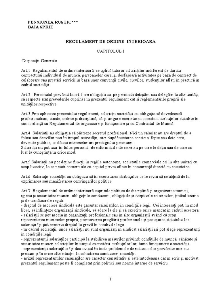 Regulamentul de ordine interioara in unitate. Regulamentul de ordine interioara contine reguli cu caracter obligatoriu ce trebuie respectate de catre toti angajatii cat si de angajator. 2 regulamentul de ordine interioară stabileşte dispoziţii referitoare la organizarea şi disciplina muncii în cadrul casei corpului didactic mureș în conformitate cu. Se aprobă r g 1 regulamentul de ordine interioară în unitate care face parte integrantă din prezentul ordin. Regulamentul intern are si un rol important pentru activitatea angajatorului este documentul prin care angajatorii reglementeaza in principal regulile de conduita probleme de ordin disciplinar fiind denumit de unii autori si legea disciplinara dintr o unitate.