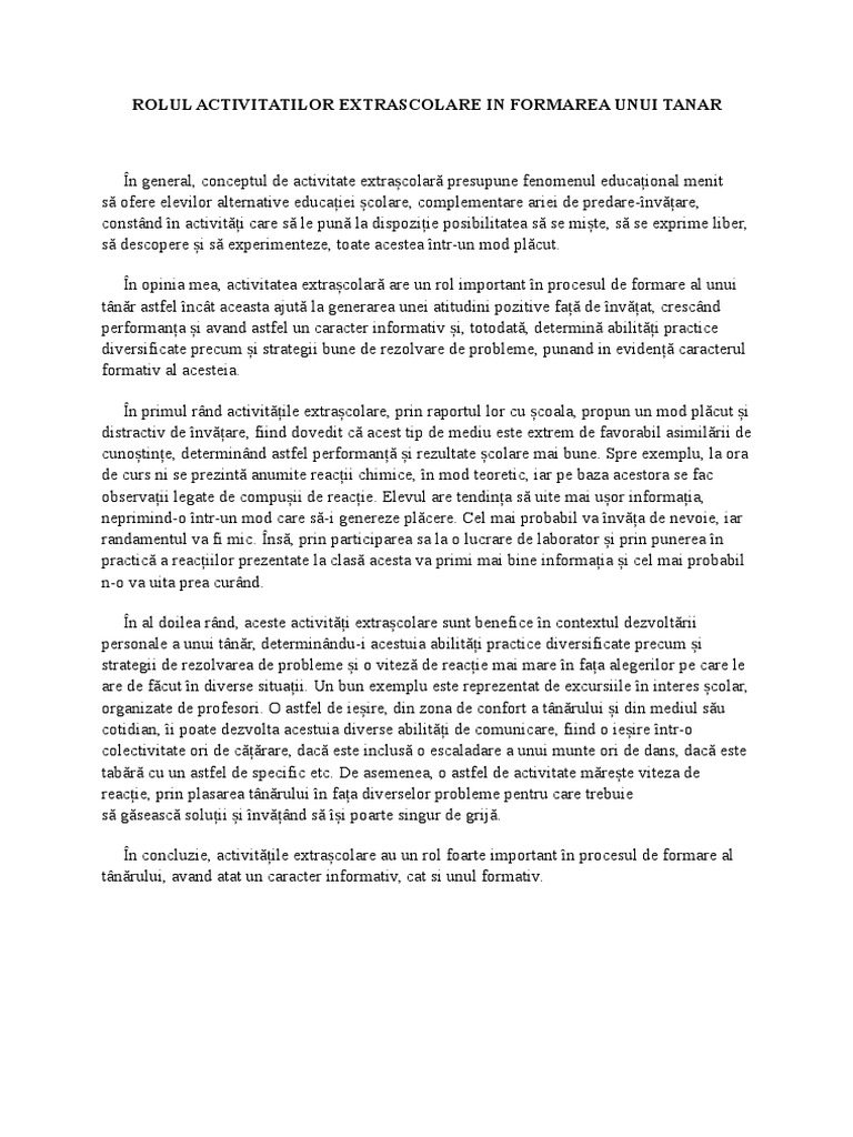 Rolul activităţilor extraşcolare în procesul instructiv educativ. Această lume nu va mai exista când ei vor fi mari şi nimic nu ne permite să ştim cum va fi lumea lor. Academia edu is a platform for academics to share research papers. Rolul activitatilor extrascolare in viata copilului tau.