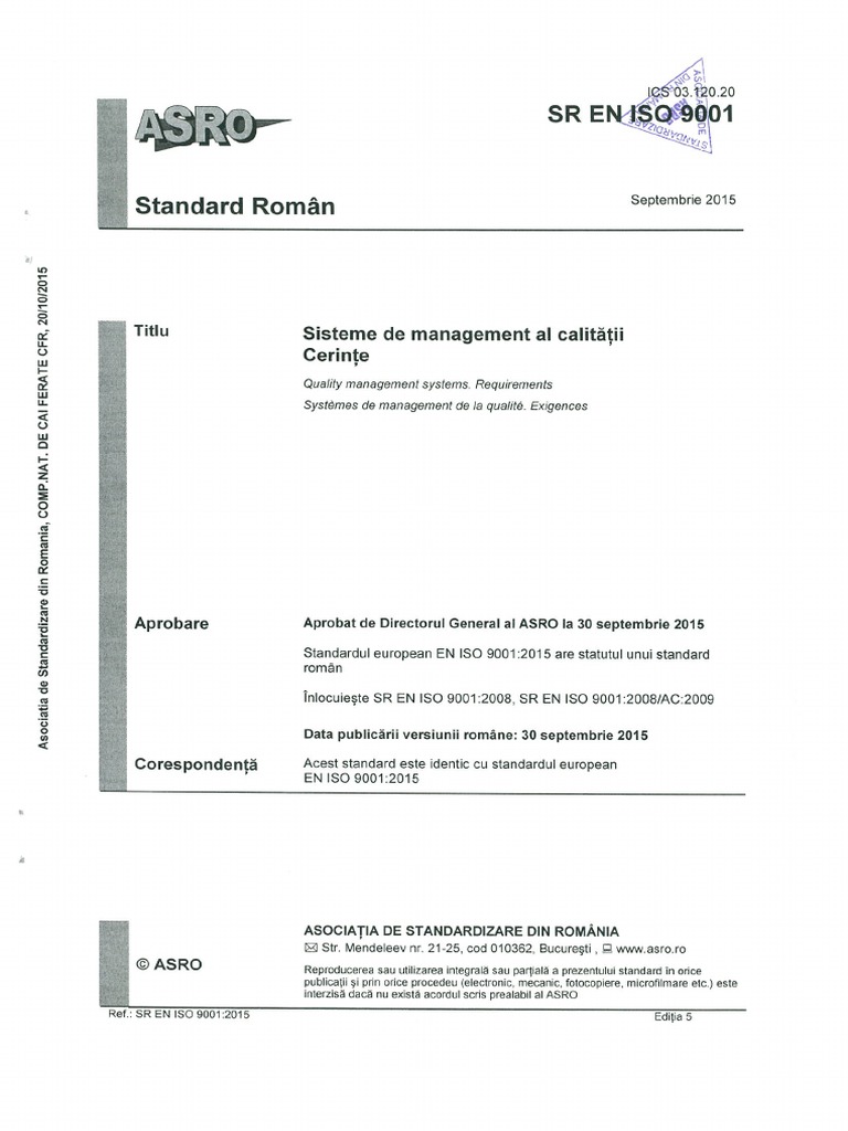 Peter löpp leiter der zertifizierungsstelle. Sr en iso 9001 2015 scribd com. 10 noiembrie 2015 asro vă oferim posibilitatea de a consulta primele pagini ale standardului sr en iso 9000 2015. Noua versiune a sr en iso 9001 2015 a fost publicata in octombrie 2015 si prezinta un standard modernizat care indeplineste noile tendinte de calitate si creste importanta acestui sistem de management pentru rezultatele unei organizatii.