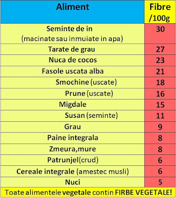 Tabel cu alimente bogate in fibre. O jumătate de cană cu mazăre conţine 5 6 grame de fibre. Mai mult fibrele sunt un excelent instrument în lupta cu constipația deoarece reglează tranzitul intestinal. Taratele sunt bogate in fibre vitamina b6 si magneziu. O posibila lista cu fructe si continutul lor in fibre este urmatoarea.