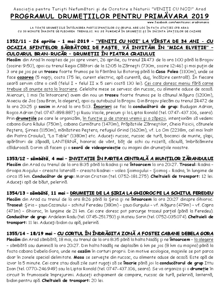 Veniti cu noi arad. Grupul de dialog veniți cu noi arad românia își propune să promoveze programele asociaţiei pentru turişti nefumători şi de ocrotire a naturii veniţi cu noi. Programul drumeţiilor pentru primavara 2018. 1362 21 6 14 iulie invitaţie la drumeţie în munţii cozia şi căpăţânii precum şi în staţiunea balneoclimaterică călimăneşti căciulata. Publicat de veniti cu noi arad la 21 51 0 comentarii.